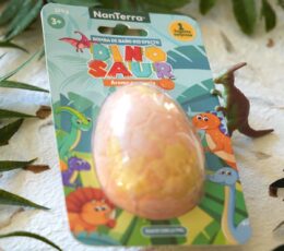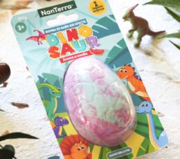 Bomba de baño en forma de huevo de dinosaurio efervescente al contacto con el agua, se revela un juguete.