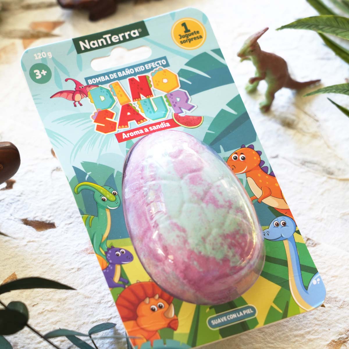 Bomba de baño en forma de huevo de dinosaurio efervescente al contacto con el agua, se revela un juguete, divertido en el baño especialmente para niños. Con aroma a sandía. El producto contiene ingredientes seguros y respetuosos con la piel.